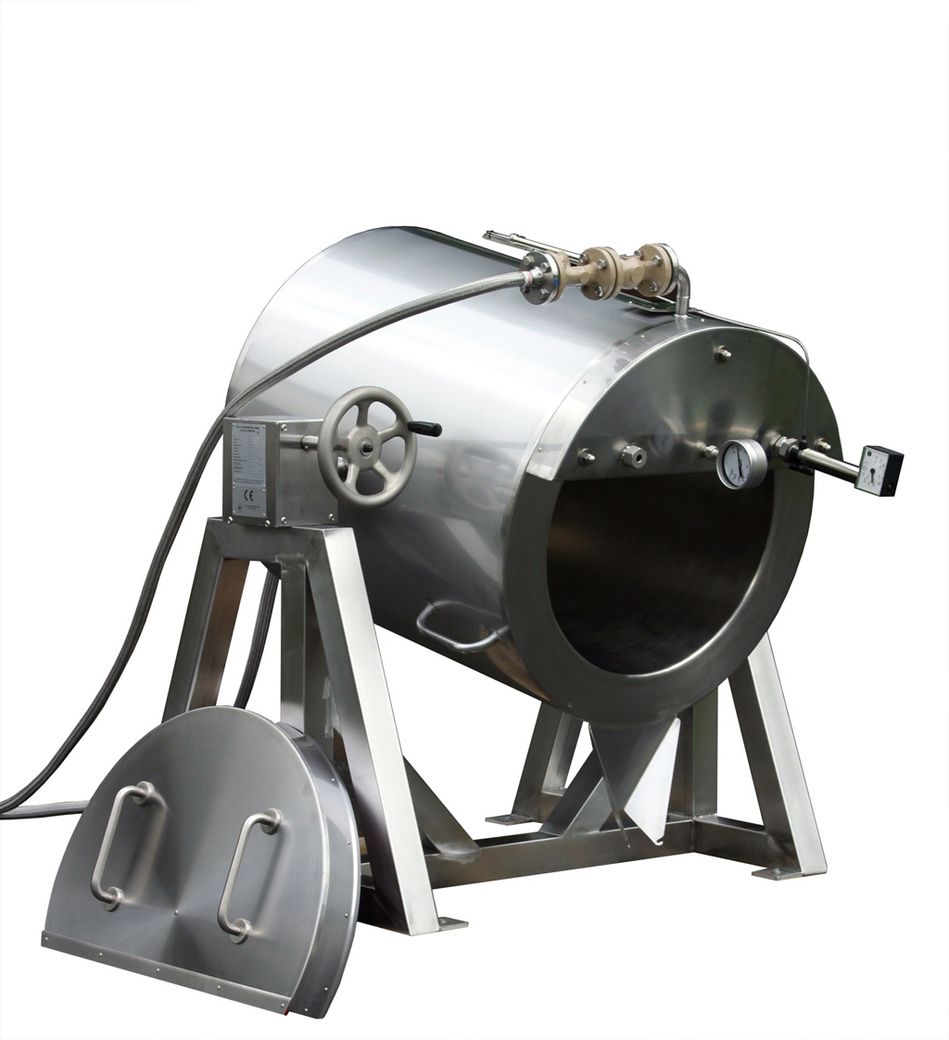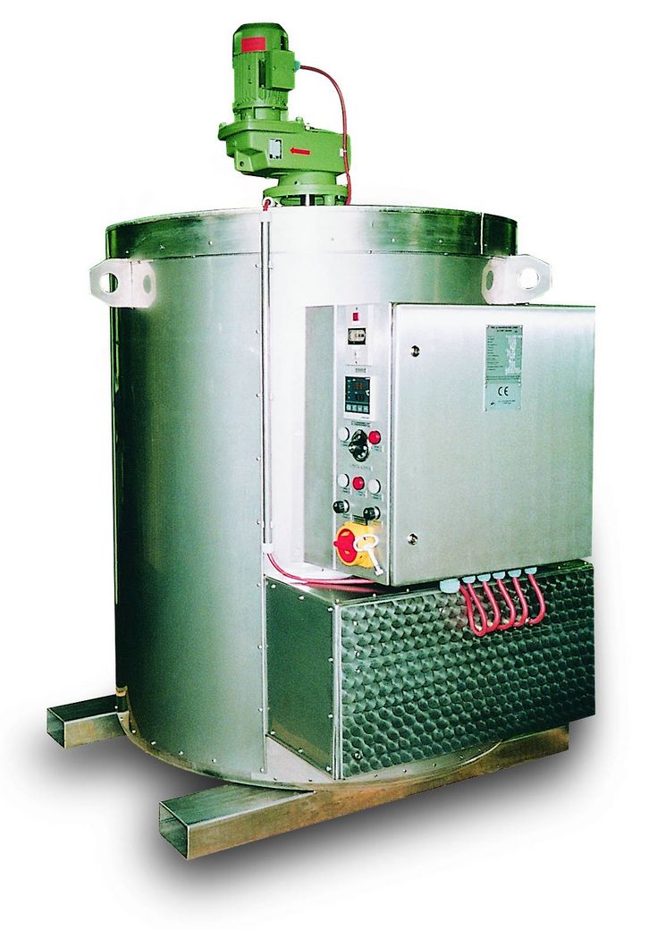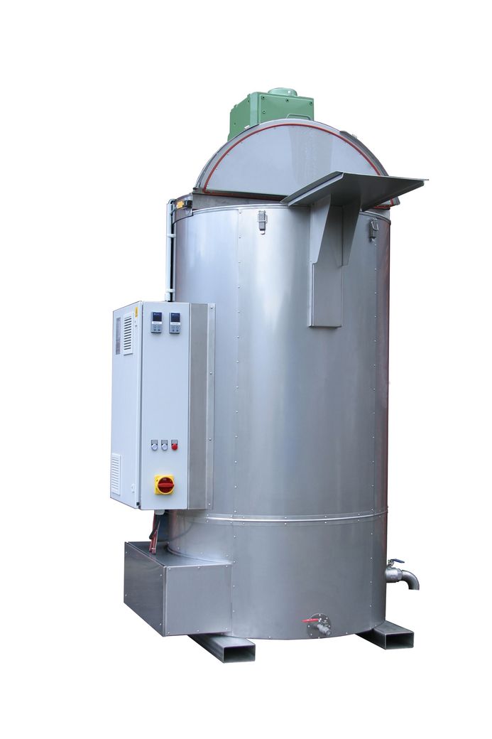 Zur schonenden Aufschmelzung temperaturkritischer Rohstoffe dient diese Heißwasser-Wärmekammer mit einem Drehtisch für 4 Fässer.